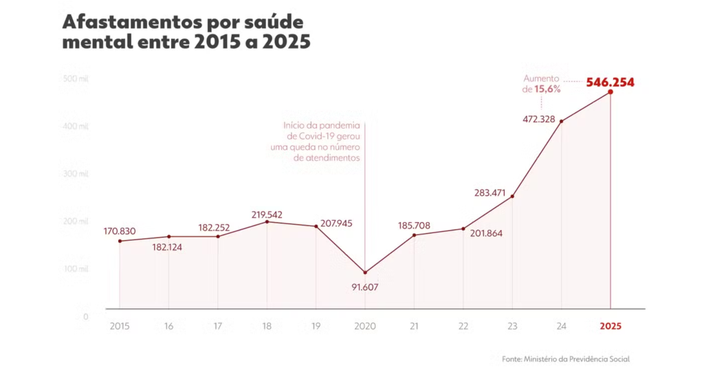 Em 2025, o Brasil bateu, pela segunda vez, o recorde com o maior número de afastamentos do trabalho por transtornos mentais em uma década. Ao todo, foram 546.254 mil licenças concedidas – uma alta de 15% se comparado com o ano anterior.